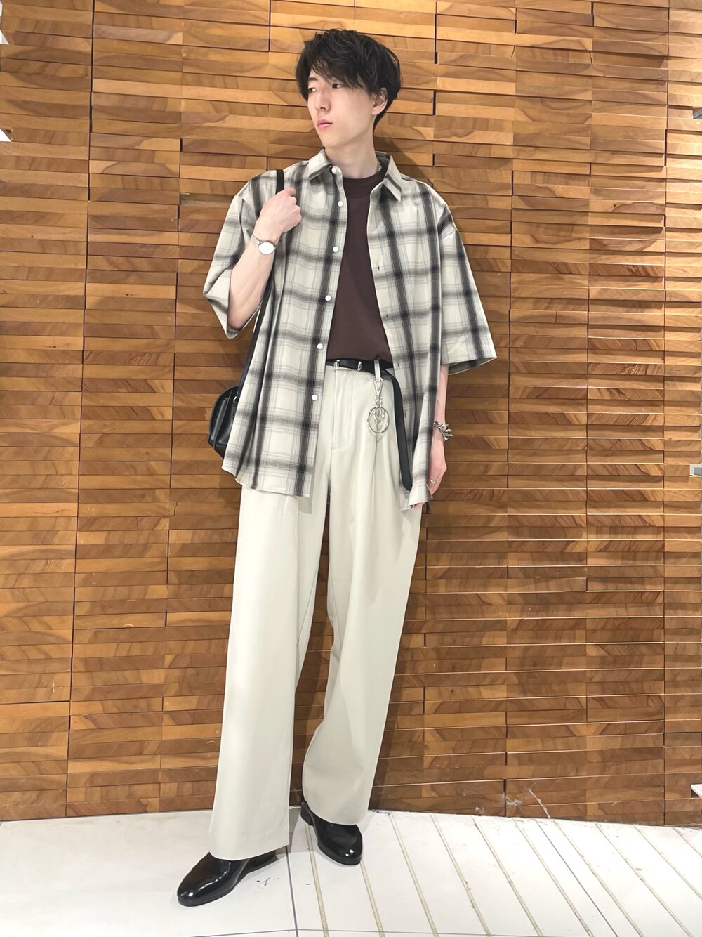ご覧いただきありがとうございます! チェックシャツを使った淡色コーディネートになってます。 柔らかい雰囲気を出しながらも小物をレザーでまとめる事で一気に引き締まって見えるのでおすすめです。 シャツがルーズシルエットになっているのでタックインすると合わせやすくスタイルもよく見えます。
