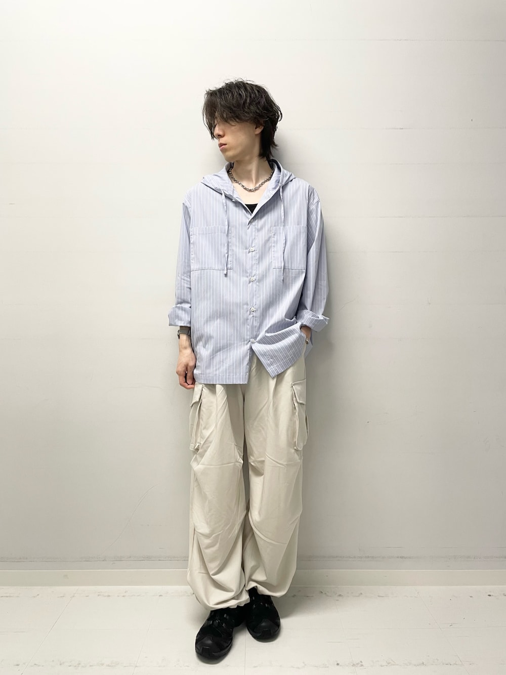 ご覧頂きありがとうございます! フーディシャツはトレンド感あり羽織だけでなく、インナーとして使えばレイヤードも楽しんで頂けます! ブルー×ホワイトで爽やかな印象なので今からの時期でも暑苦しくなくておすすめです!