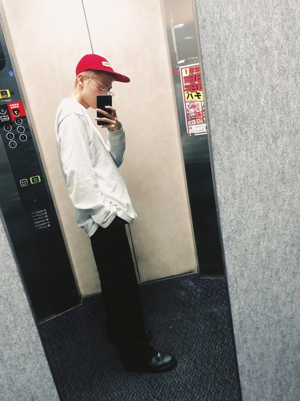 シンプルなカットソーに遊びでスウェード素材の赤のキャップ⛑ 光沢感が欲しかったのでゴールドのメガネとエアフォース😊