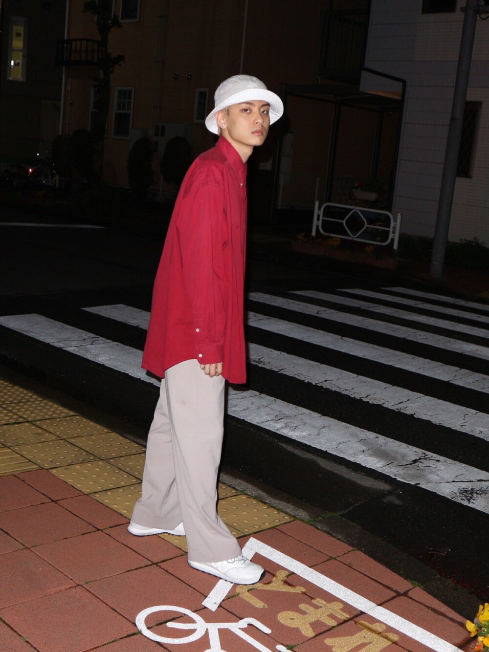 赤のラルフシャツをメインにコーディネイト。 邪魔しないようようにグレーと白で締める。