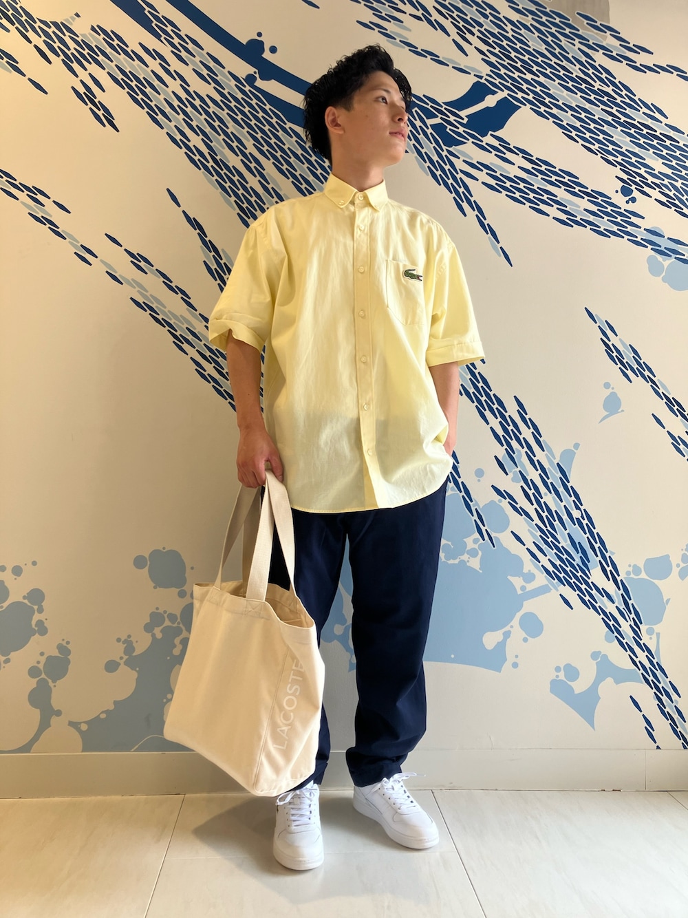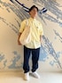 ゆったりとしたフィット感のシャツなので ボタンを全開にして羽織りとして使ってもシルエットが綺麗です。 トップスに明るい色を持ってくる事で顔映りも明るくなり夏らしい印象のシャツを着用しました! 色展開も3色あり、ホワイト、ブルーもございます。 是非コーディネートの参考にして下さい! 着用サイズ シャツ 39(JP.M) パンツ 38(JP.S) シューズ 7.5(JP.26)