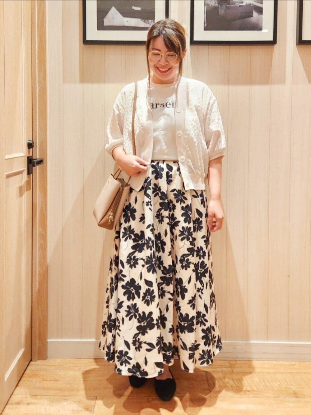 ご覧いただきありがとうございますm(_ _)m 全体的に淡いカラーでまとめました。 大きめ花柄ロングスカートがアクセント♪ モノトーンの落ち着いた大人コーデ。