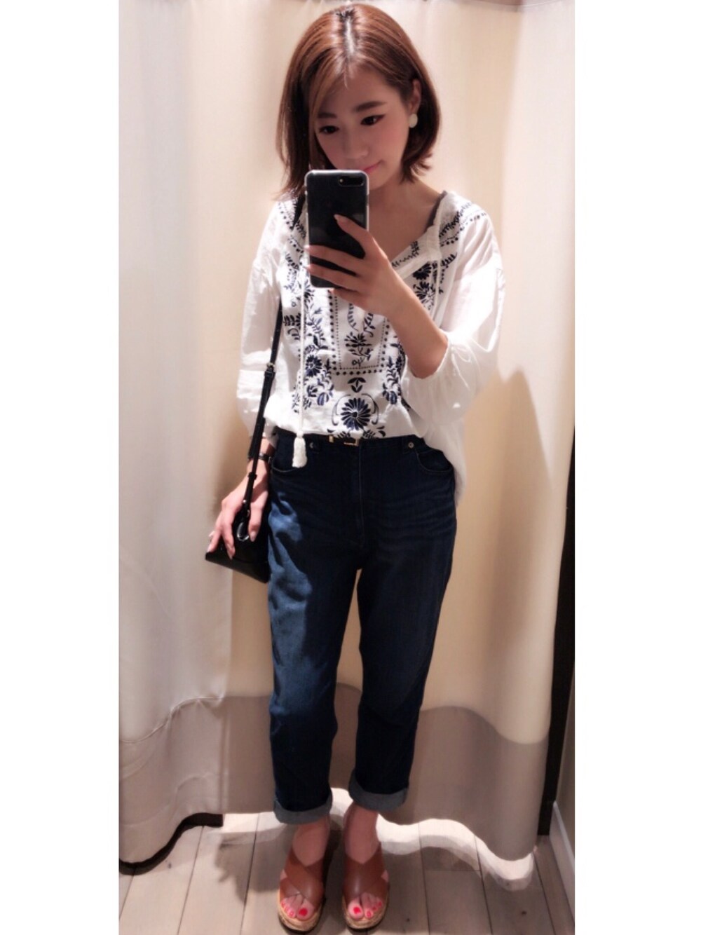 カジュアルコーデ 刺繍ブラウスが今年はたくさん欲しい デニムは股上が深くて柔らかい素材なので履きやすいよん