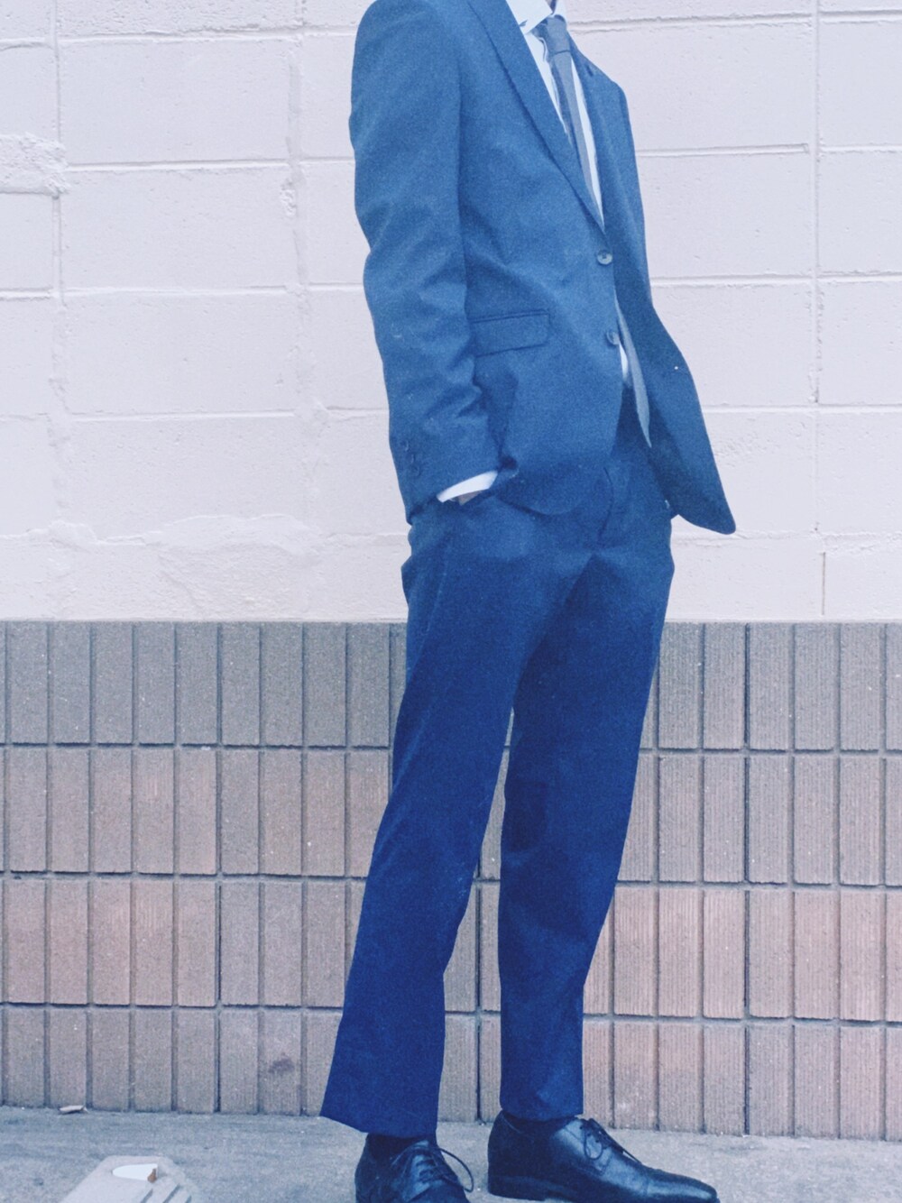ブルー系のスーツジャケットを着用したメンズの春コーディネートの1枚目の写真
