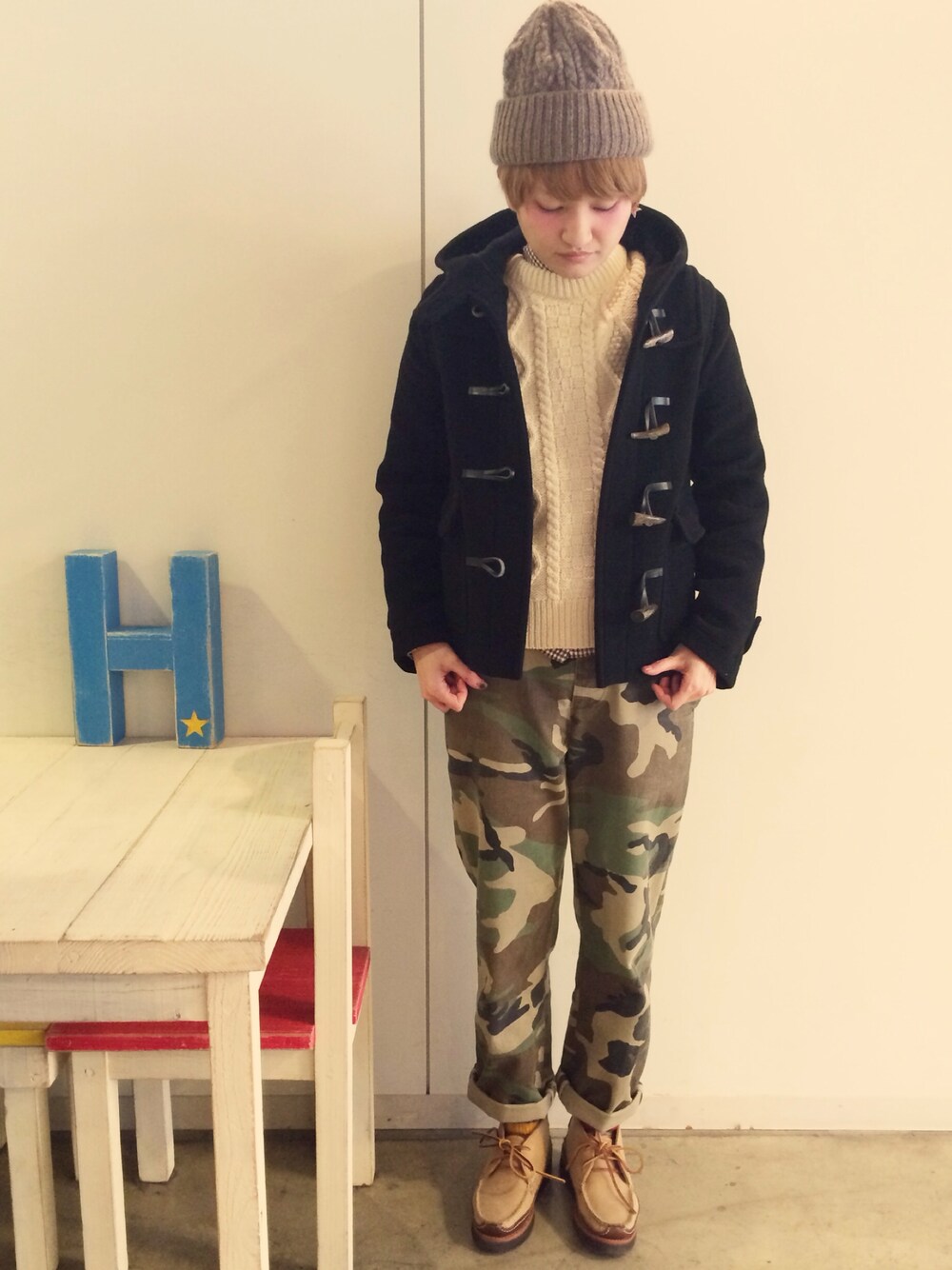 コート anotheredition ニット ジェームスシャルロット シャツ 103 パンツ beamsboy ブーツ YUKETEN ニット帽 カオリノモリ