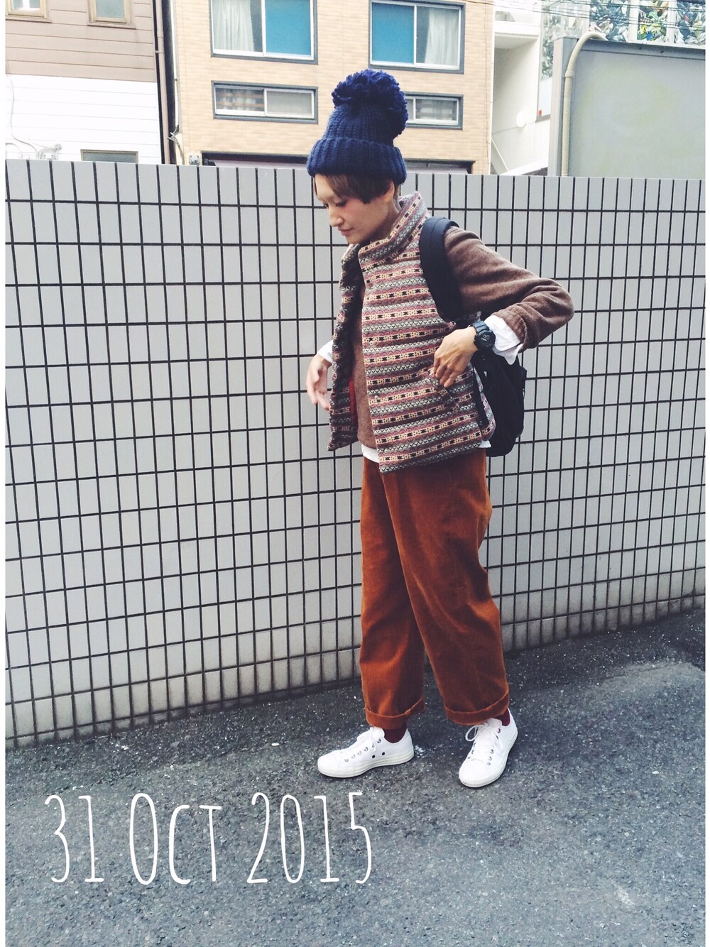 ダウンベスト beautyandyouth セーター もらいもの。 シャツ 無印良品 パンツ beamsboy スニーカー converse ニット帽 override