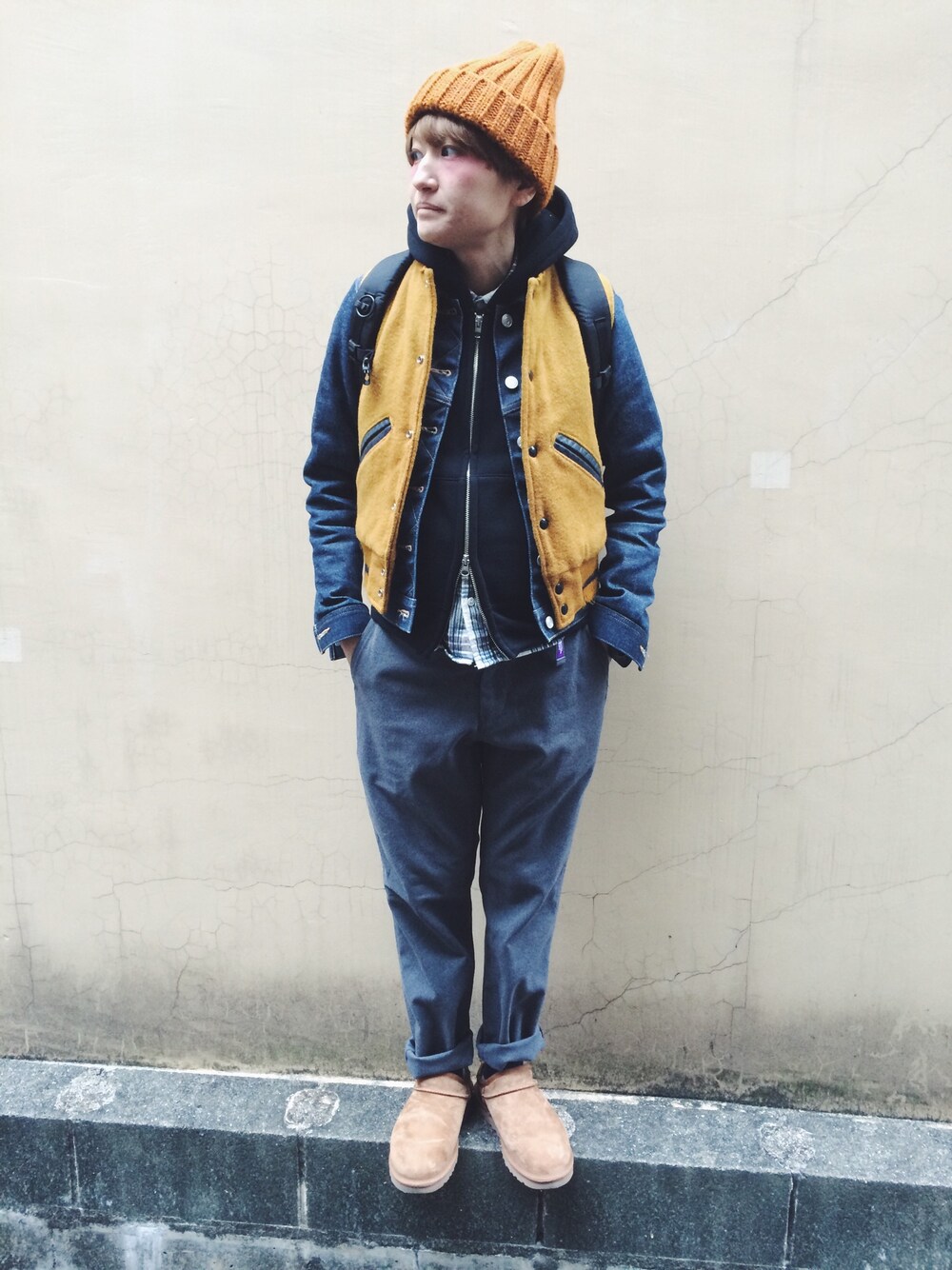 スタジャンベスト beamsboy パーカー THE NORTH FACE シャツ beamsboy Gジャン BEDWIN パンツ THE NORTH FACE purplelabel 靴 UGG ニット帽 override