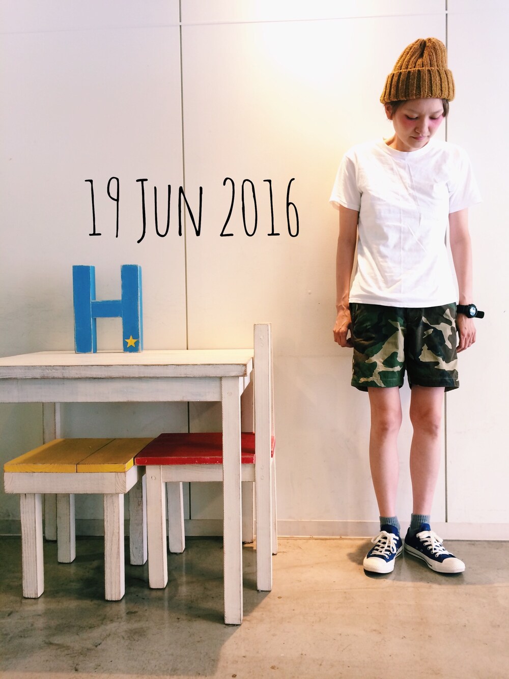 Tシャツ BEAMSBOY ショートパンツ SARO スニーカー converse ニット帽 override