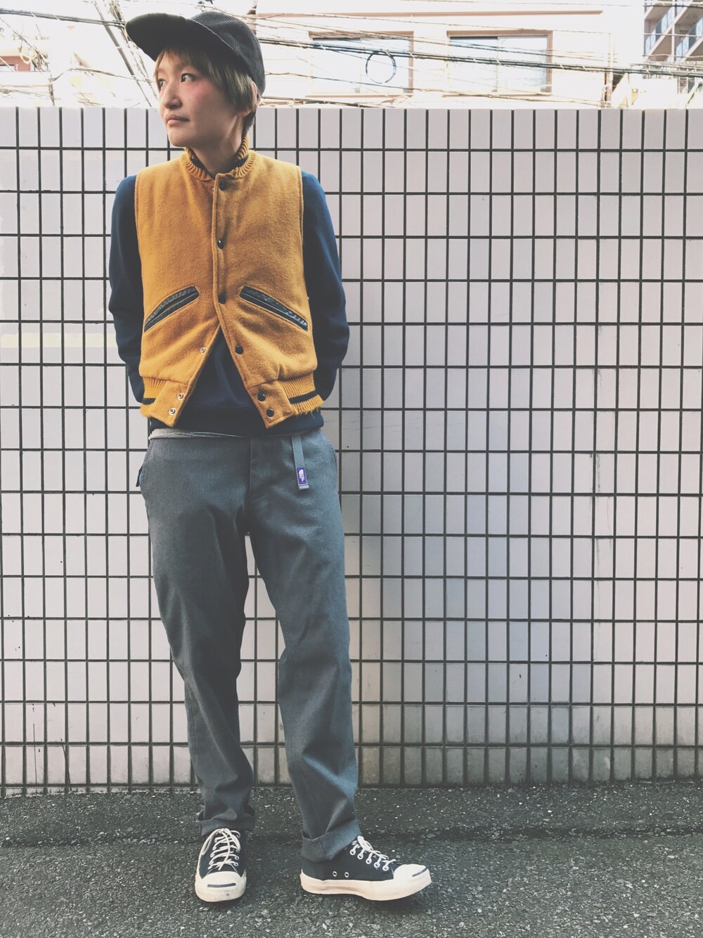 スタジャンベスト BEAMSBOY スウェット THENORTHFACE パンツ THENORTHFACE CAP unused スニーカー converse