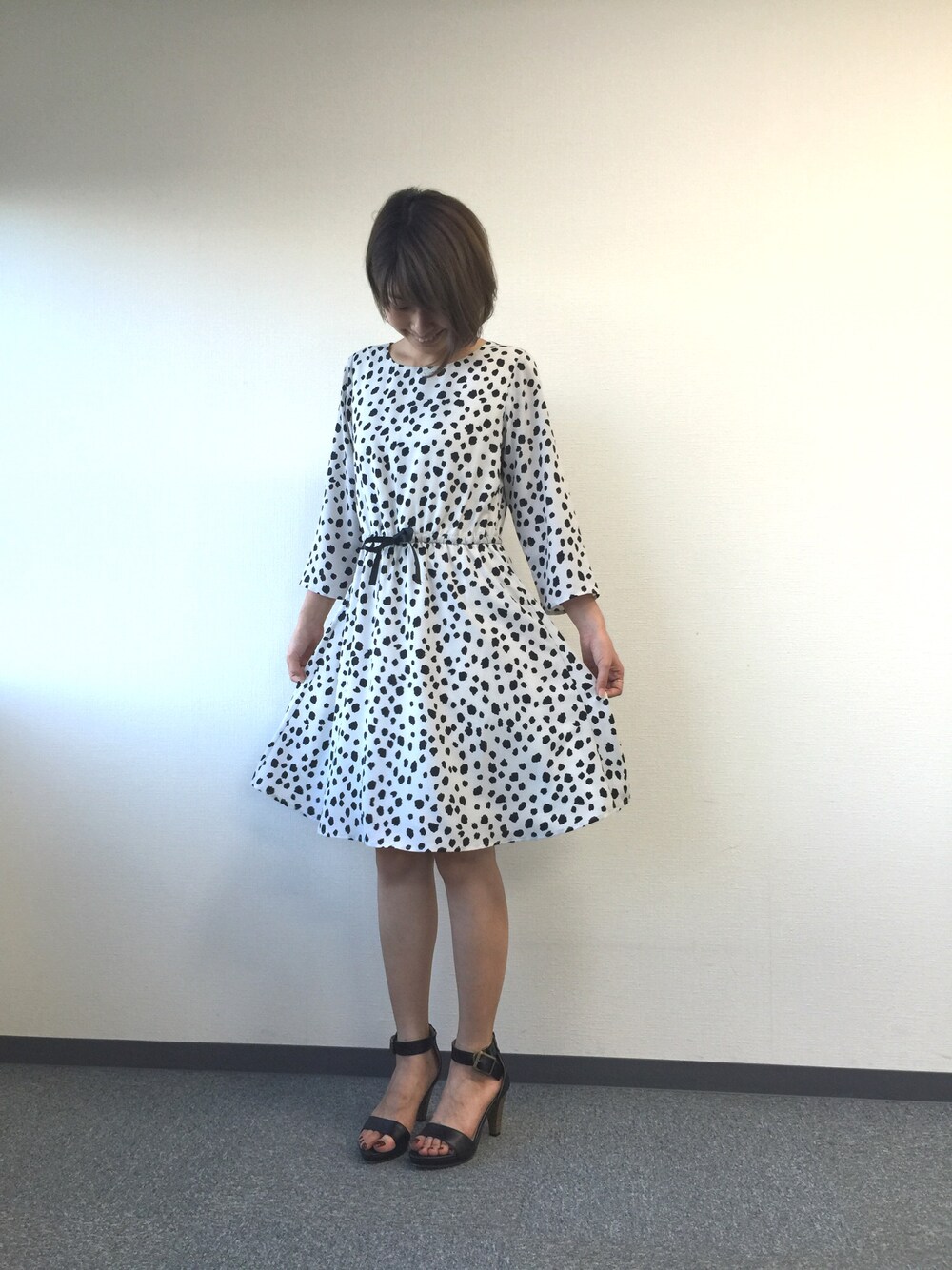 今買って秋まで着れるワンピース♡ ダルメシアン柄がかわいい上品ワンピは一枚楽して決まります! 今の季節はサンダル、もっと秋らしくなってきたらパンプスと合わせて長く使えます♪