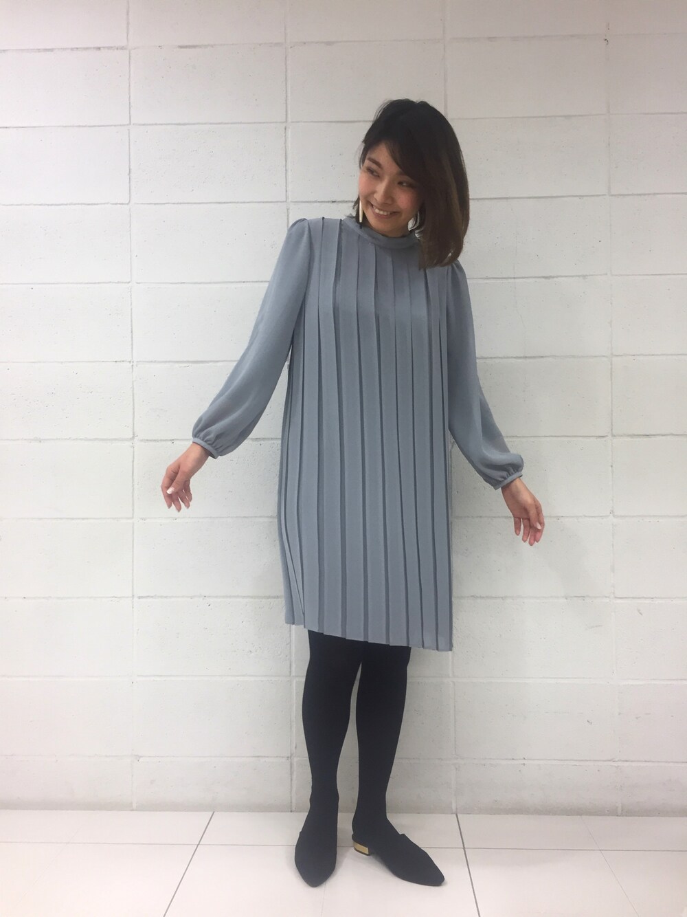 このワンピは私的イチオシ!ボックスプリーツがひらひらと揺れるたびいろんな表情を見せてくれます♡今はまだ寒いので黒タイツと合わせてますが、暖かくなったら素足で軽やかに着たいな♪今から春本番まで長く楽しめるアイテム!