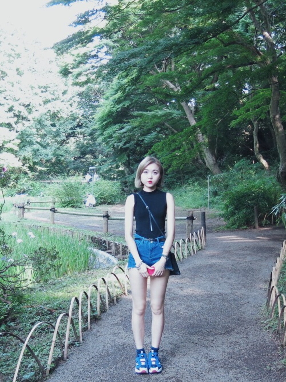 ブラック系のスニーカーを着用したレディースの夏コーディネートの1枚目の写真