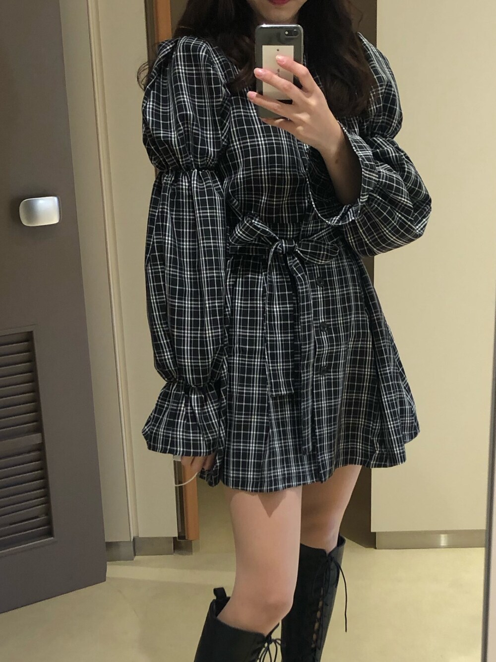 ブラック系のワンピースを着用したレディースの秋コーディネートの1枚目の写真