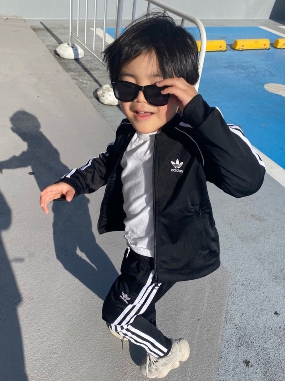 ブラック系のジャージを着用したキッズの春コーディネートの1枚目の写真