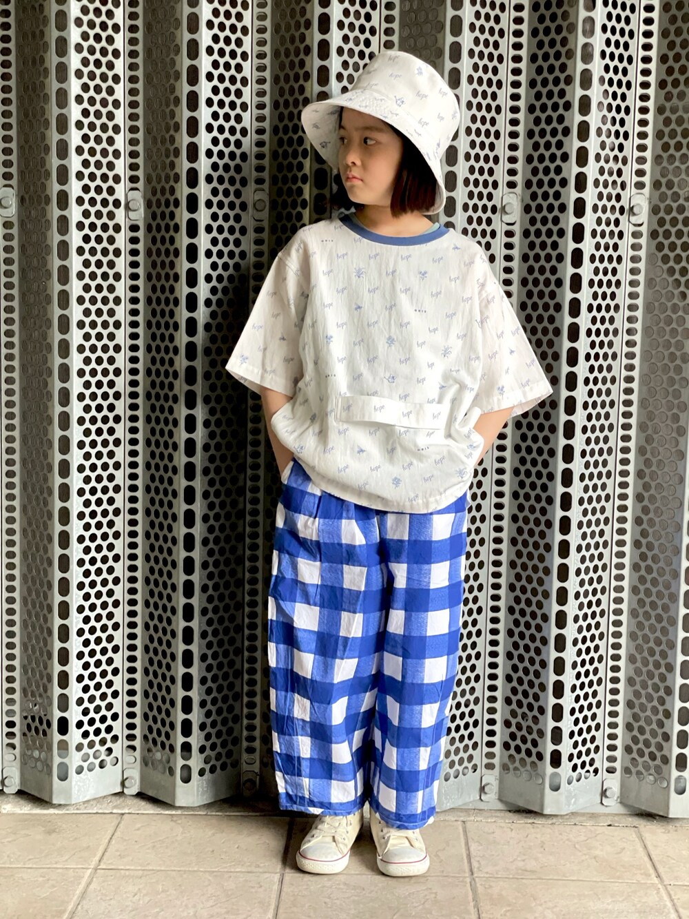 ブルー系のパンツ、ホワイト系のシャツ/ブラウス、ホワイト系のハットを着用したキッズの春コーディネートの1枚目の写真
