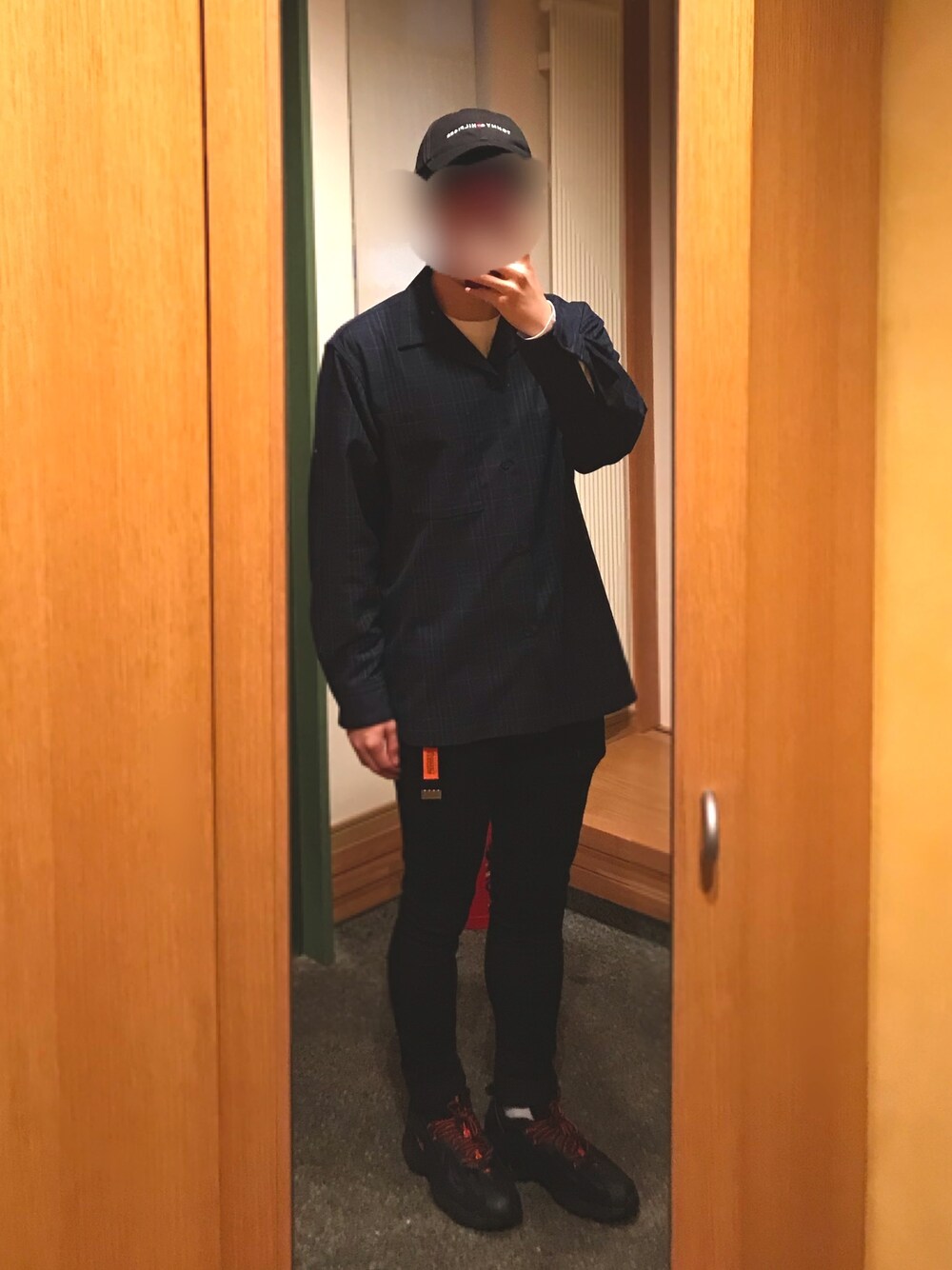 guのオープンカラーシャツ デザインも質も良き。 ユニバーサルオーバーオールのガチャベルトとスニーカーの色が一緒でよきよき。