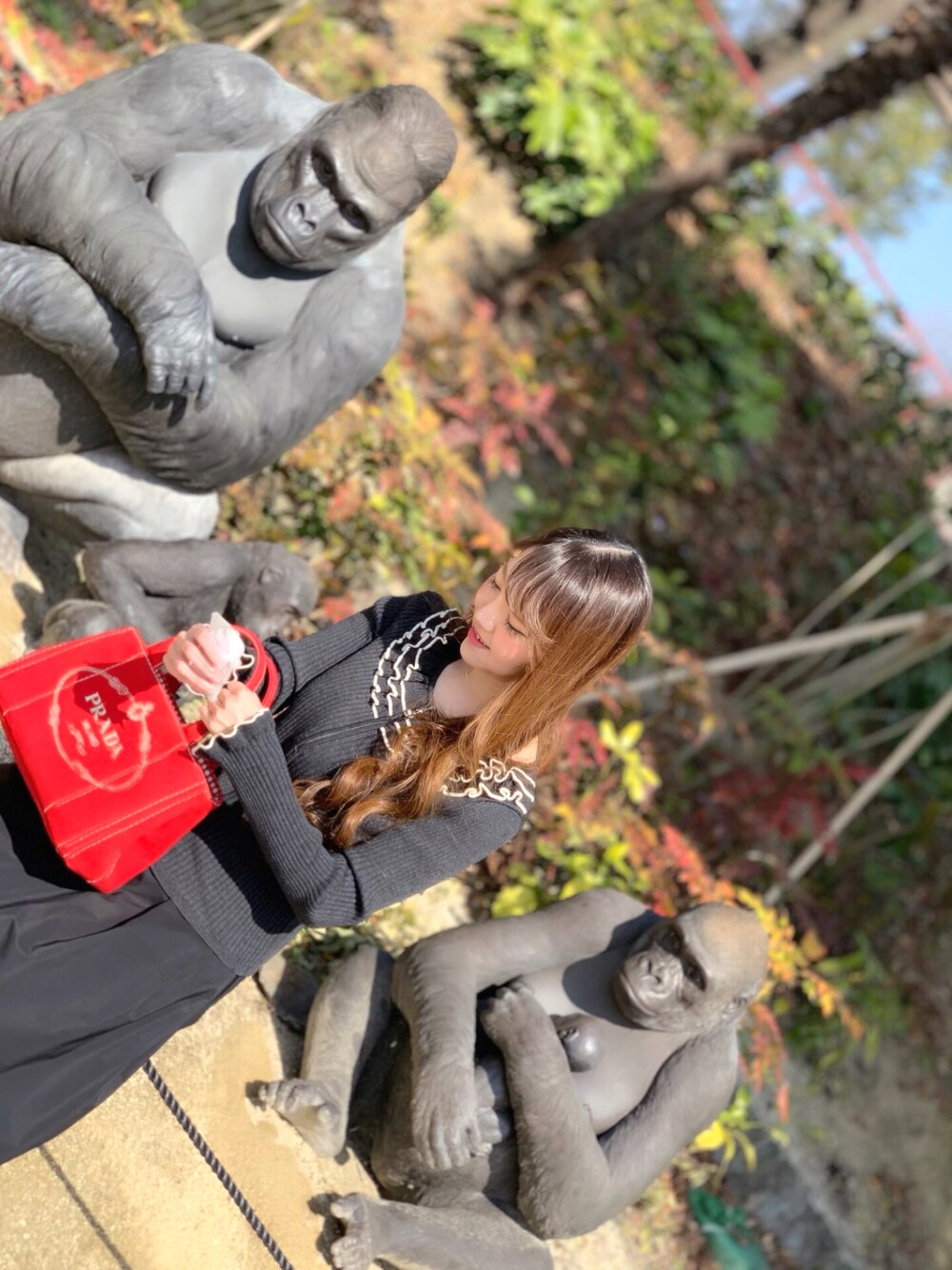 グレー系のニット/セーター、ブラック系のワンピース、レッド系のハンドバッグを着用したレディースの秋コーディネートの1枚目の写真
