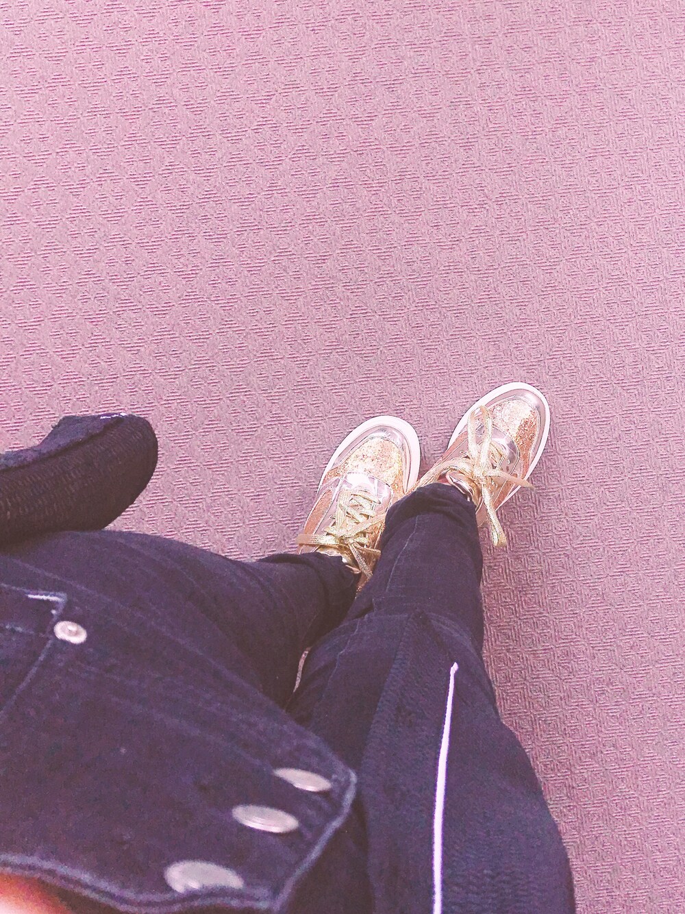 一個前の下〜 黒のハイウェスト、履きすぎて伸びたんだか私が痩せたのだか、ゆるゆるだから買い直さなきゃ〜 ゴールドを差し色に💖