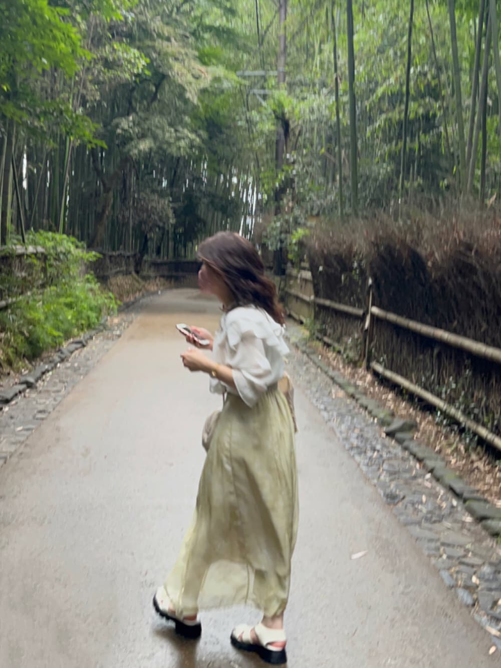 京都嵐山コーデ 緑と白の自然コーデです! スカートはサラサラの素材で動きやすくて汗も乾きやすい!