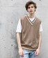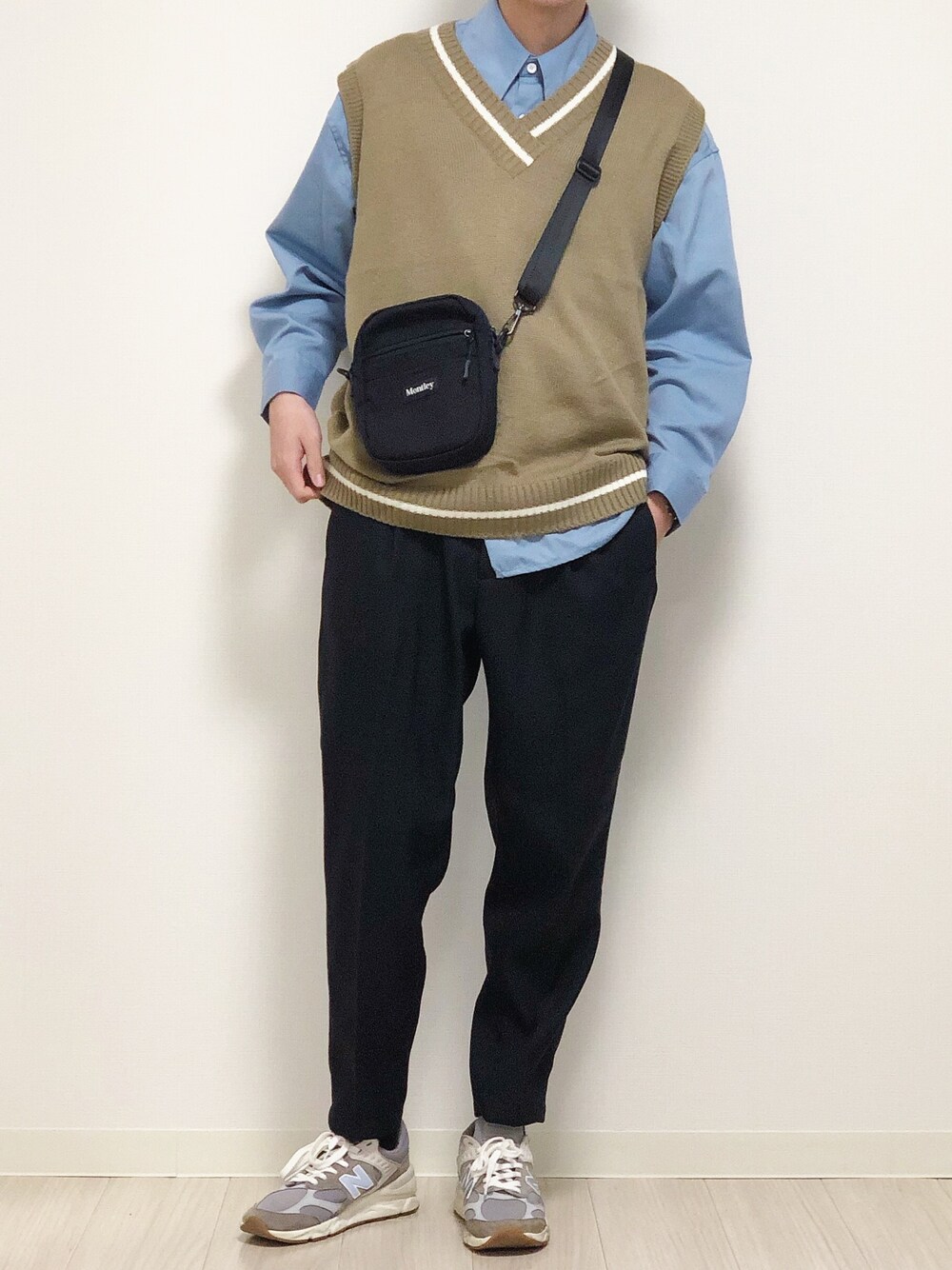 いつもいいね、SAVEありがとうございます!!! ニットベストで韓国っぽくしました🥺🇰🇷 青シャツとベージュベストの相性🥺