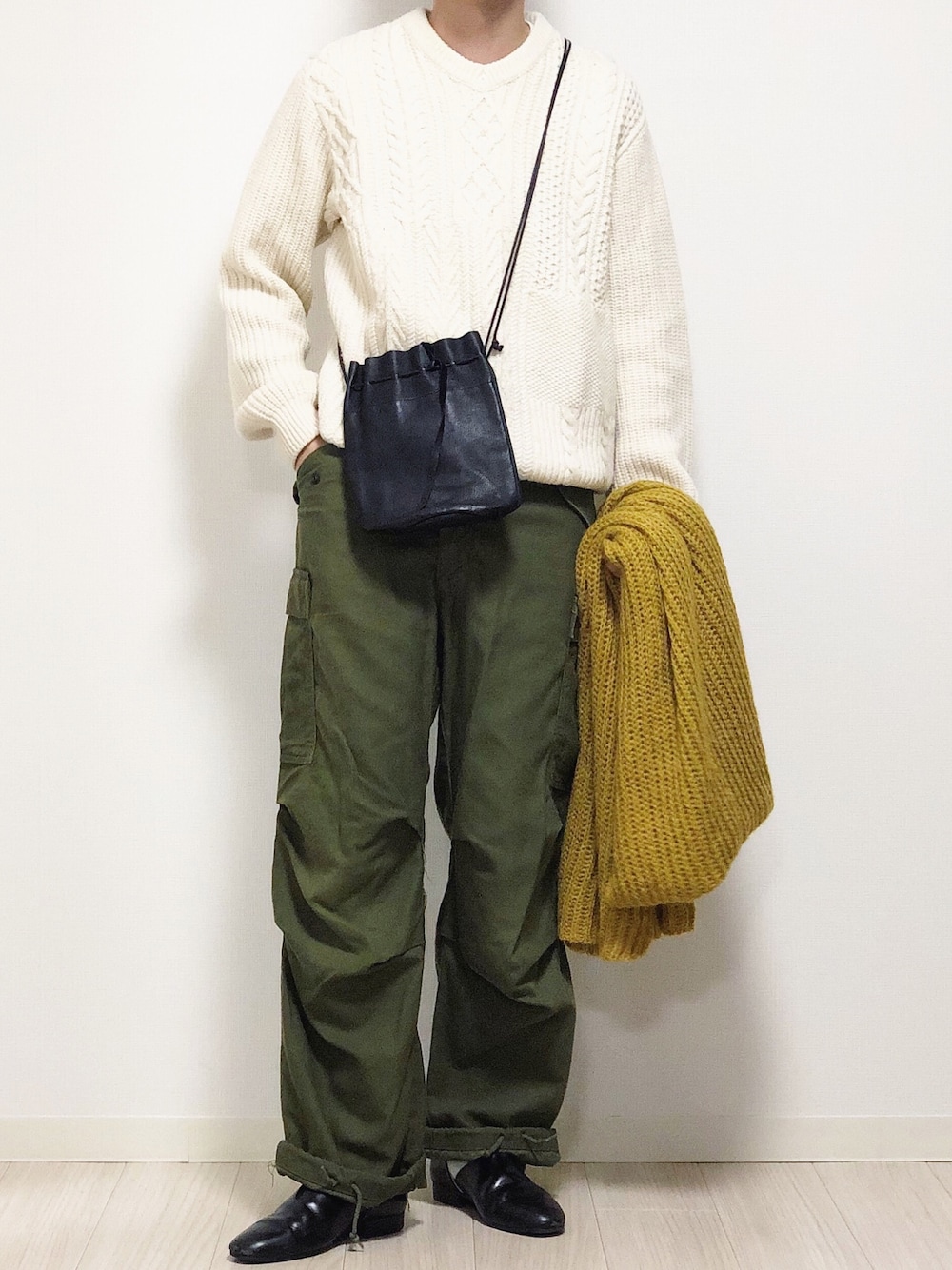 着用コーデ:346件reposukeのニット/セーター「【VALLIS】アランケーブルニットVネック」を使ったコーディネート
