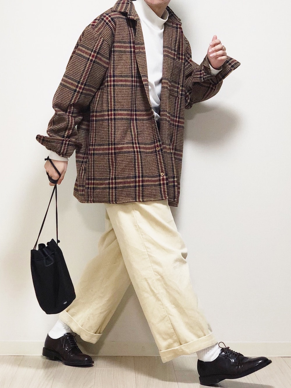 チェックシャツと白パンツは割と自分の中では鉄板の合わせだから是非やってみてほしい😌 久々に茶色革靴履きました