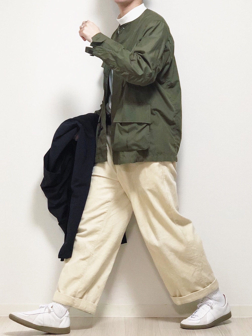 ミリタリー系のシャツと白パンツなかなか相性がいい😌