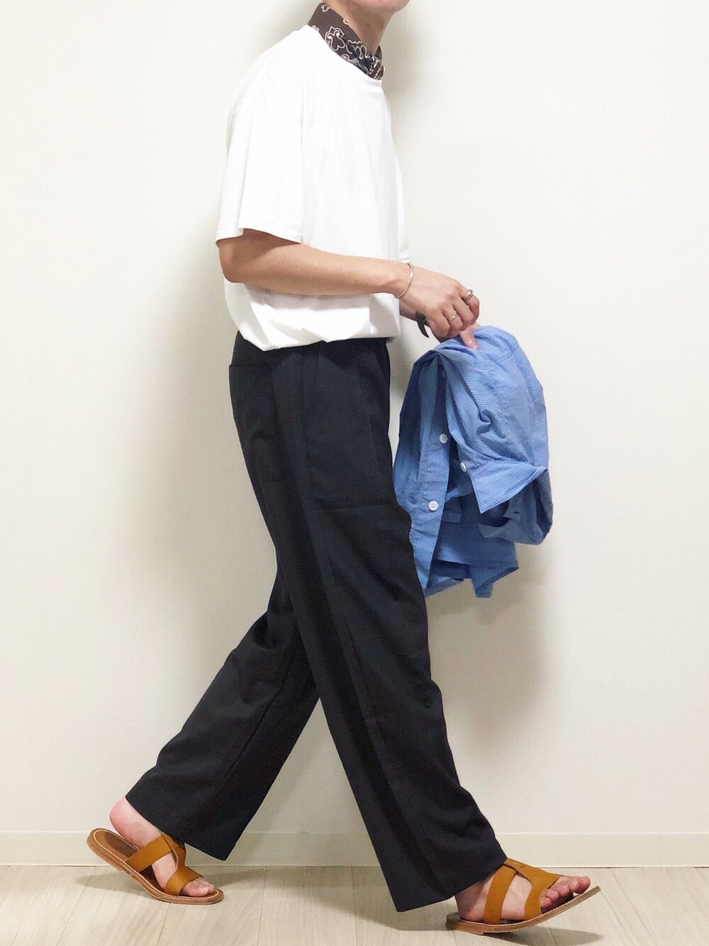 ブラウンチェックパンツにブラウンサンダル😌 白Tだけだとちょっと寂しかったのでバンダナ巻きました🥺