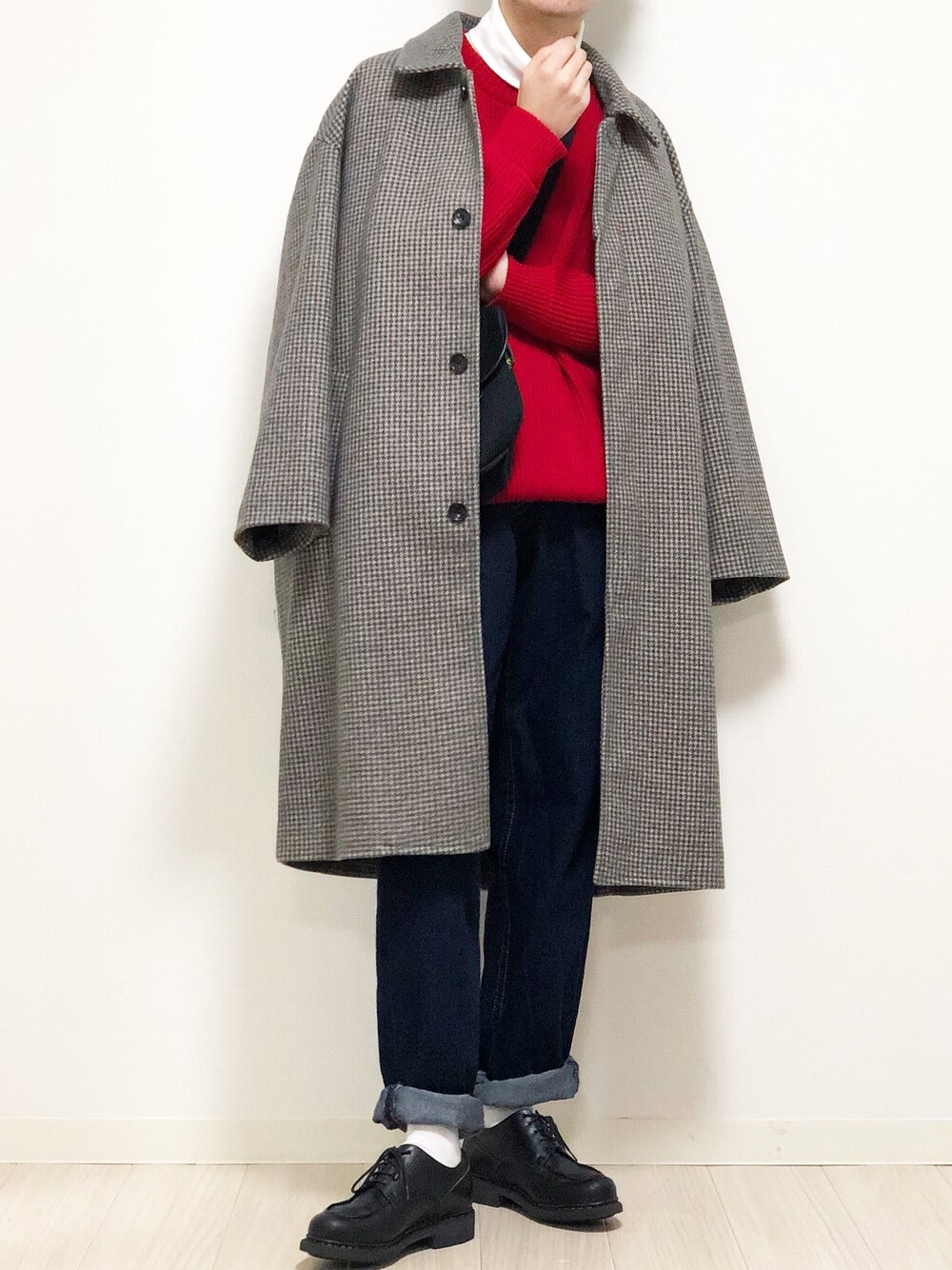 赤ニットにチェックコートでトラッドコーデ😌
