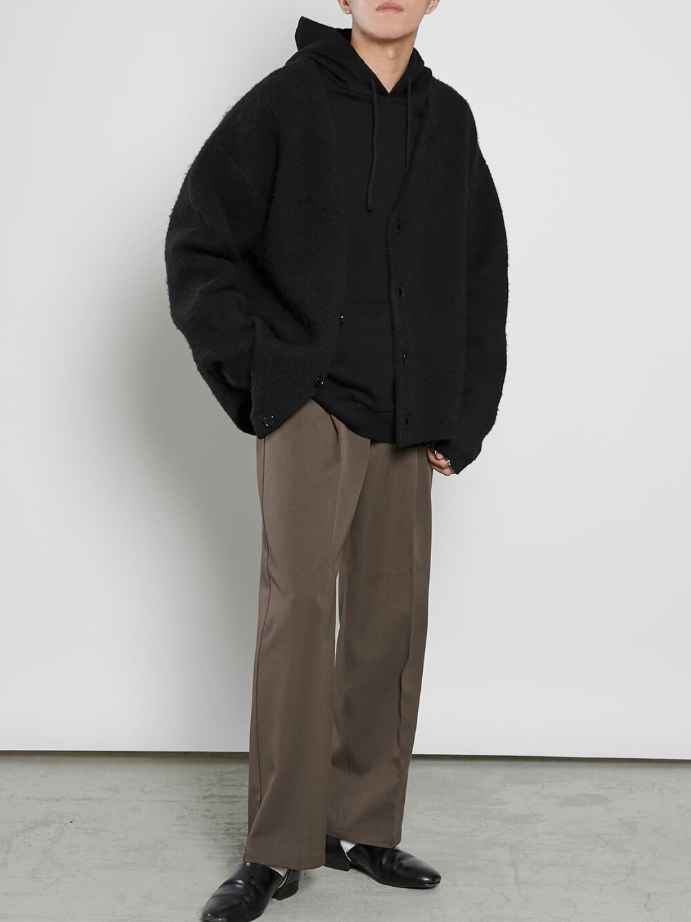 パーカーonカーディガンで楽に防寒🙆♂️ キツネさんのスラックス形綺麗だなー