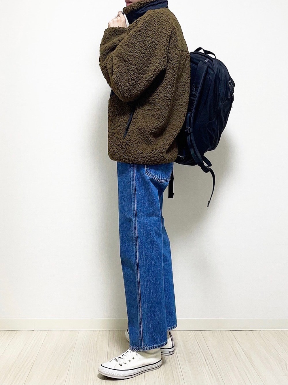 ボアとデニムとコンバースで楽ちん通学コーデ🙆♂️ ブラウンとブルーの相性の良さよ^_^
