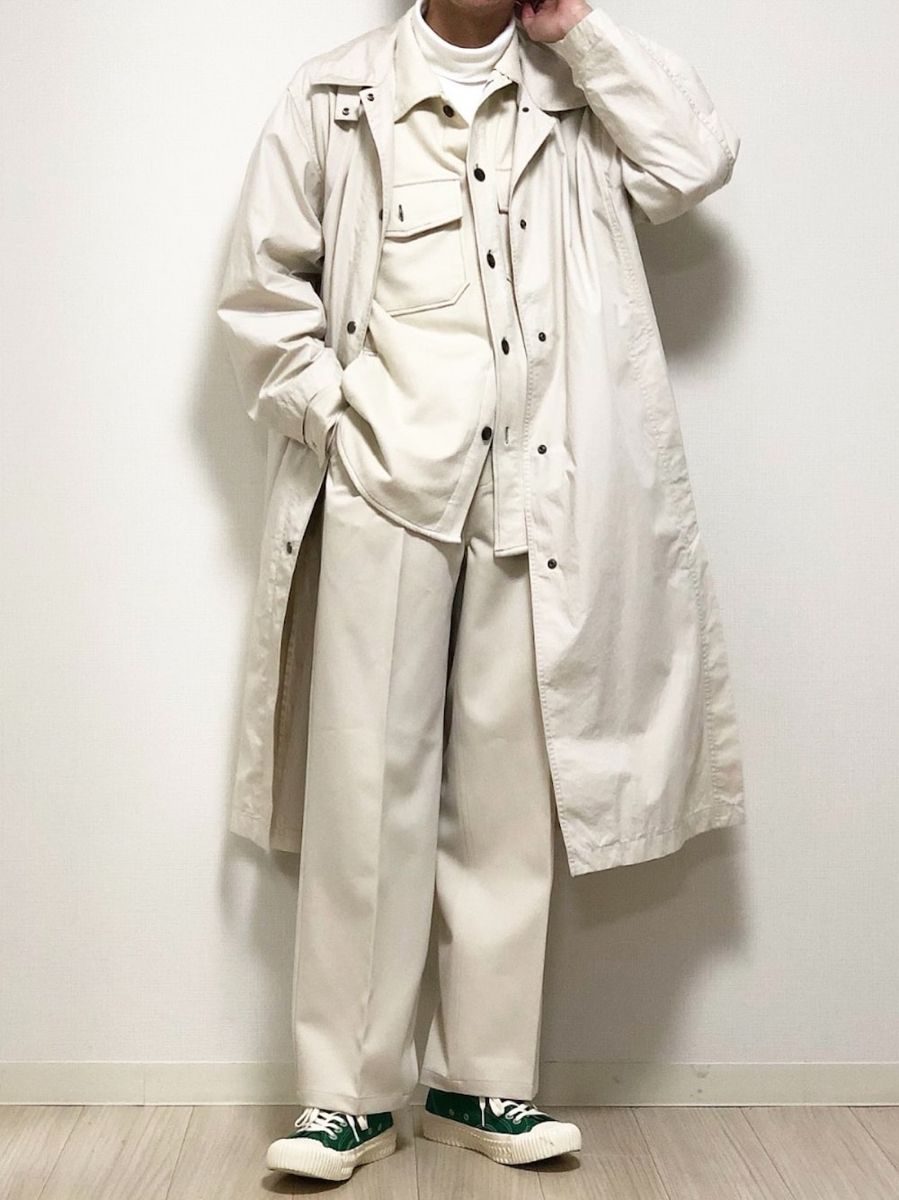 アウター、トップス、パンツのオールホワイト🥰 美術館とか行くのには良さそうコーデ🙆♂️