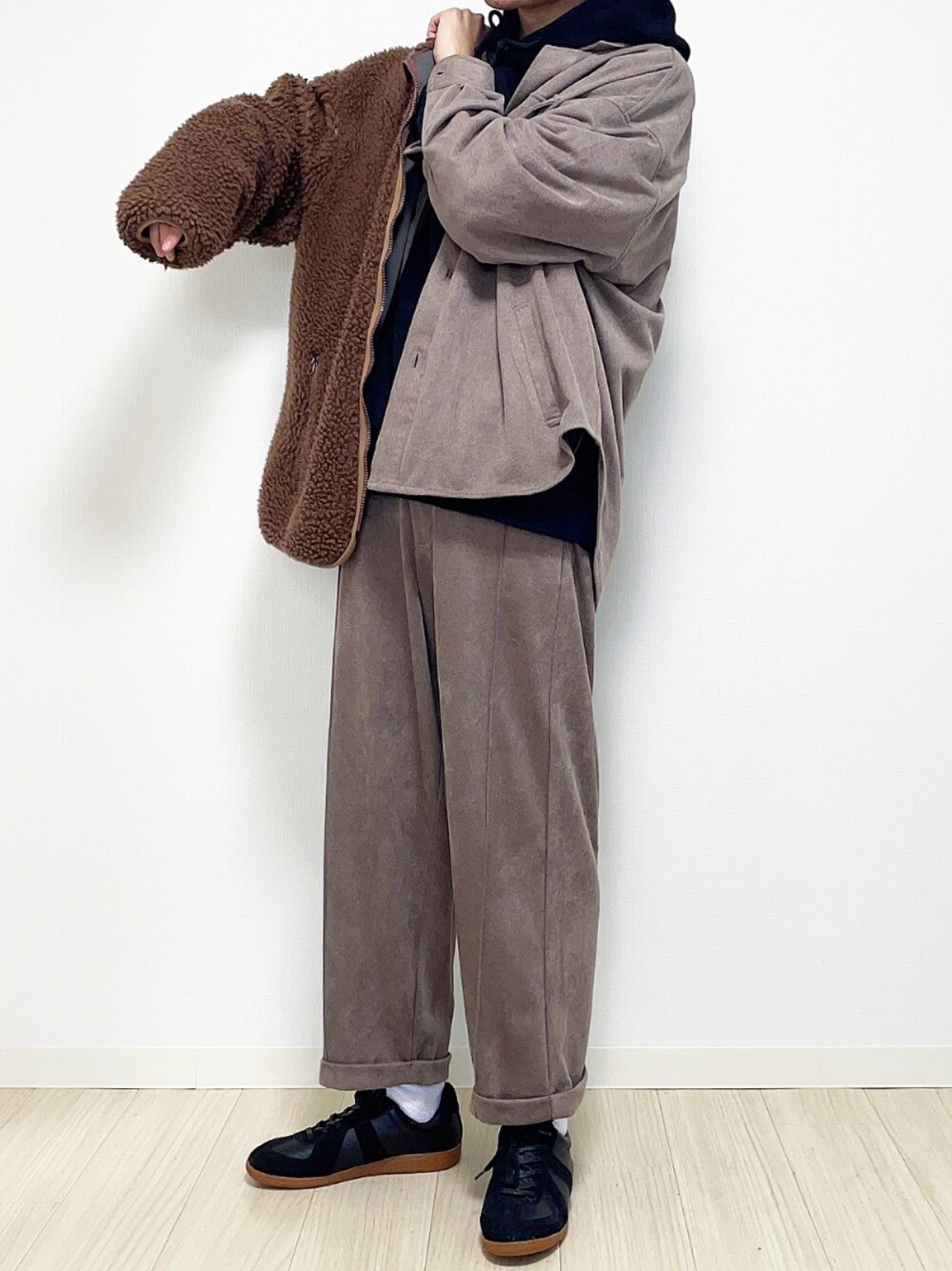モカの色味のセットアップにボアジャケ🙆♂️ ただパーカー着るより脱いだらかわいいので良いですね🥰