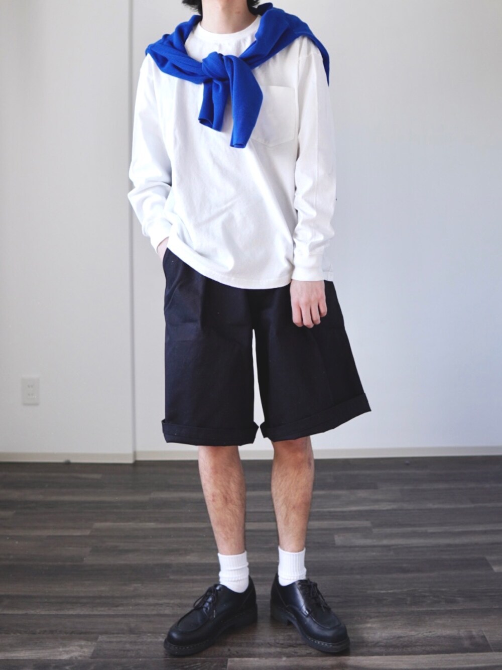 シンプルすぎたので青で差し色🟦 グルカショーツかわいいなぁ🙆♂️