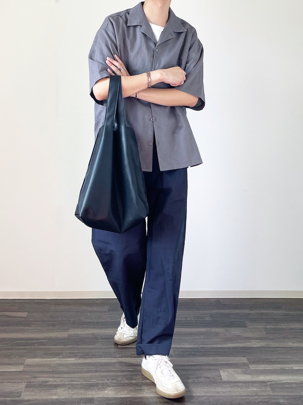 グレー✖️ネイビーにレザーバッグでアクセント🙆♂️