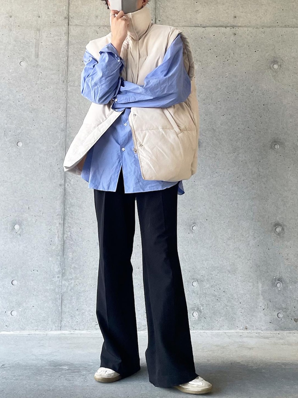 青シャツ✖️白ダウンベスト相性良〜!!!