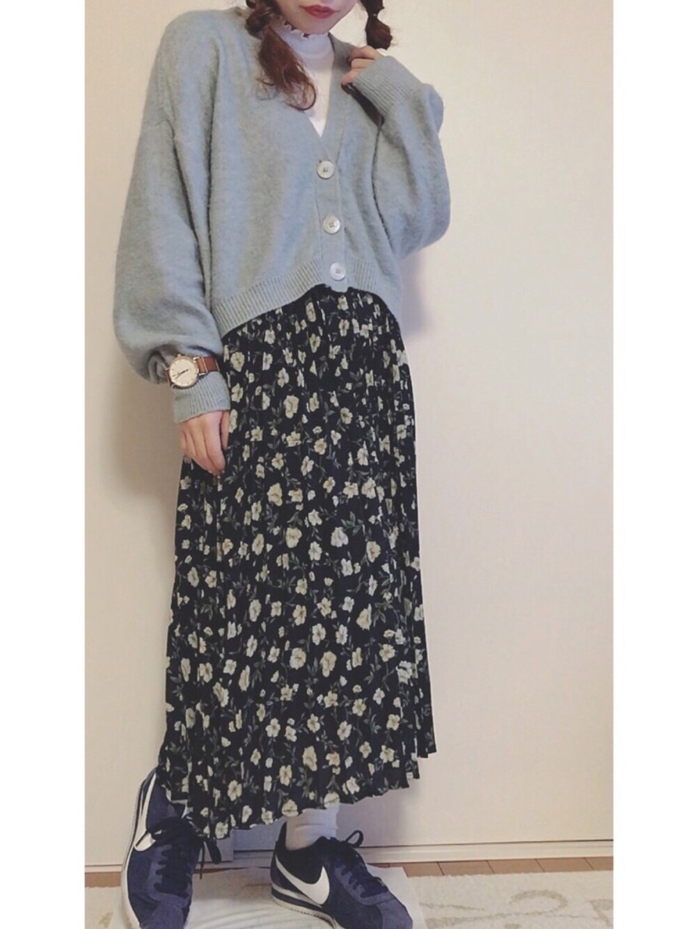 おはようございます 😪 ご覧いただきありがとうございます ♡ 寒色系コーデ ❄️ ショート丈カーディガン合わせやすくって ついたくさん着ちゃいます ♡ 花柄スカートもブルー系のトップスと合わせると 可愛さを抑えられますよ 💭 いつもクールなファッション、、 でも可愛い服にも挑戦してみたい、、! なんて方におすすめです 😉 ぜひチャレンジしてみてください ♡ ぜひお近くのearthへ足を運んでみてくださいね ♡