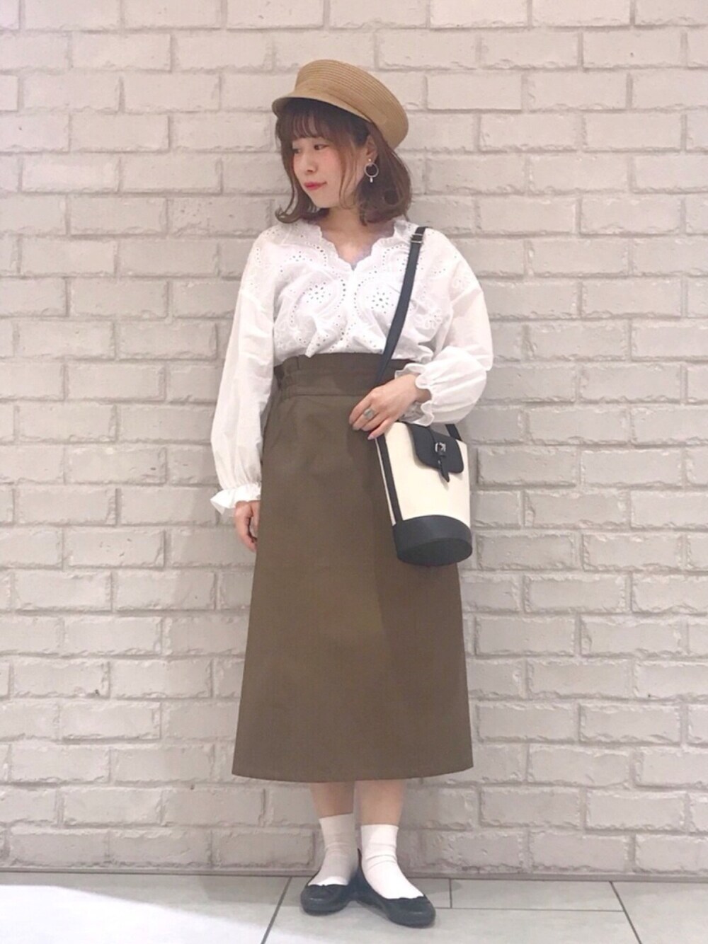 こんばんは 💭 ご覧いただきありがとうございます ♡ 白 × 黒 × 茶 3色コーデです 🐶🐾 刺繍ブラウスはVネックのスカラップなので デコルテを綺麗に見せてくれます! 女性らしさと可愛さをいっぺんに出せる1枚です 🌹 (素晴らしい〜 ♡) ぜひお近くのearthへ足を運んでみてくださいね ♡