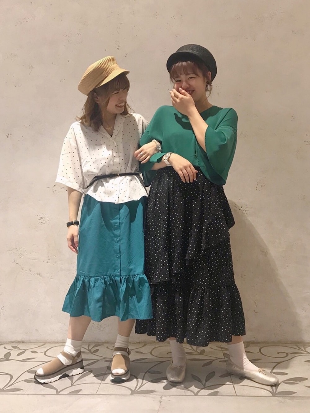 こんばんは 💫 ご覧いただきありがとうございます ♡ リンクコーデ 👯♀️ ドット × グリーン 帽子も色違いだし、スカートのシルエットも似てる 💋 earthは色とサイズの展開が豊富なので シミラールックやリンクコーデもおすすめです ♡ ぜひお近くの店舗へ足を運んでみてくださいね!