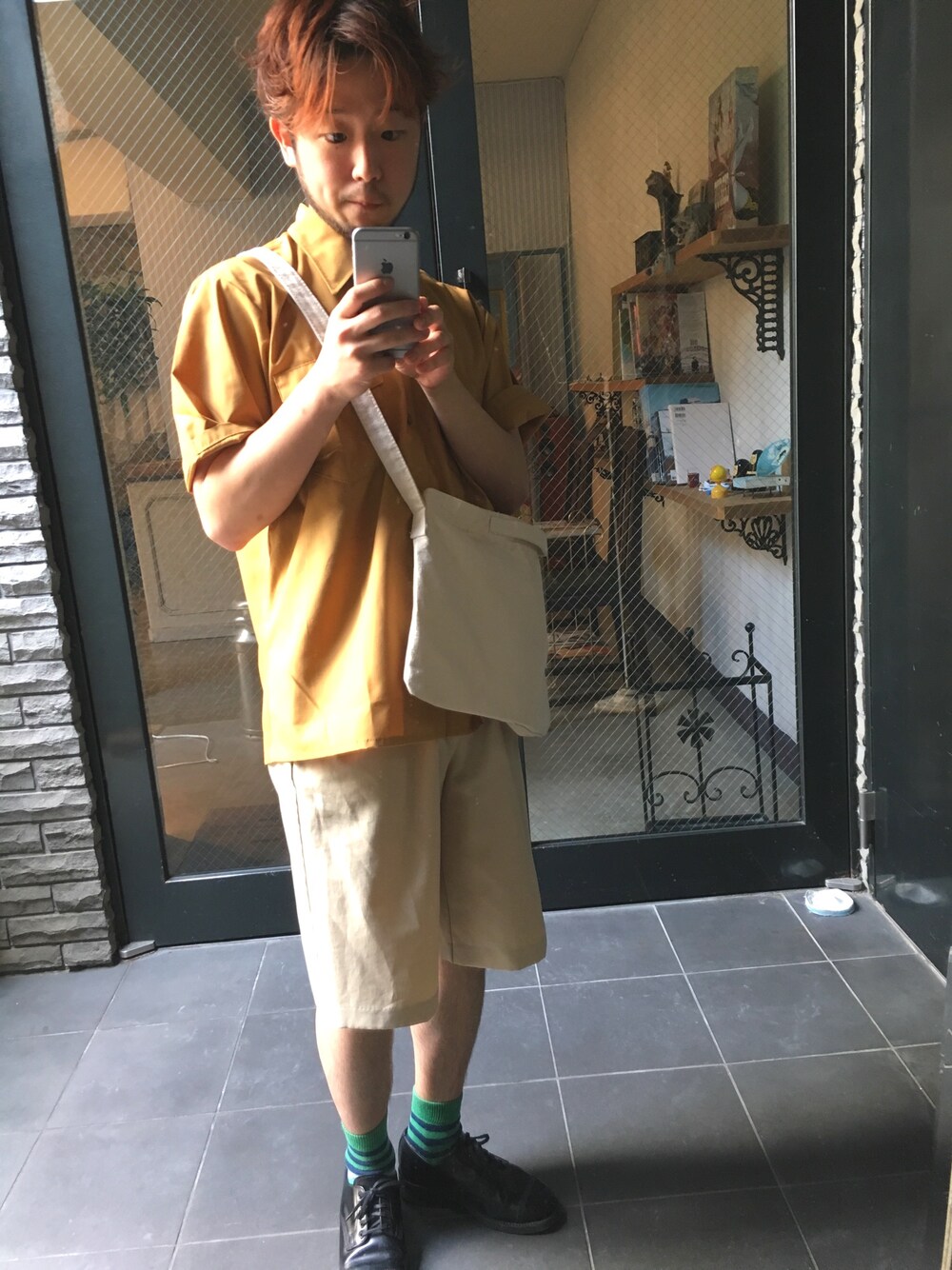 暑いのでハーフパンツでベージュに黒の革靴にワンポイント緑を入れてみました! ボーダーの青が暗く濃いので黒の革靴との相性が良いです!