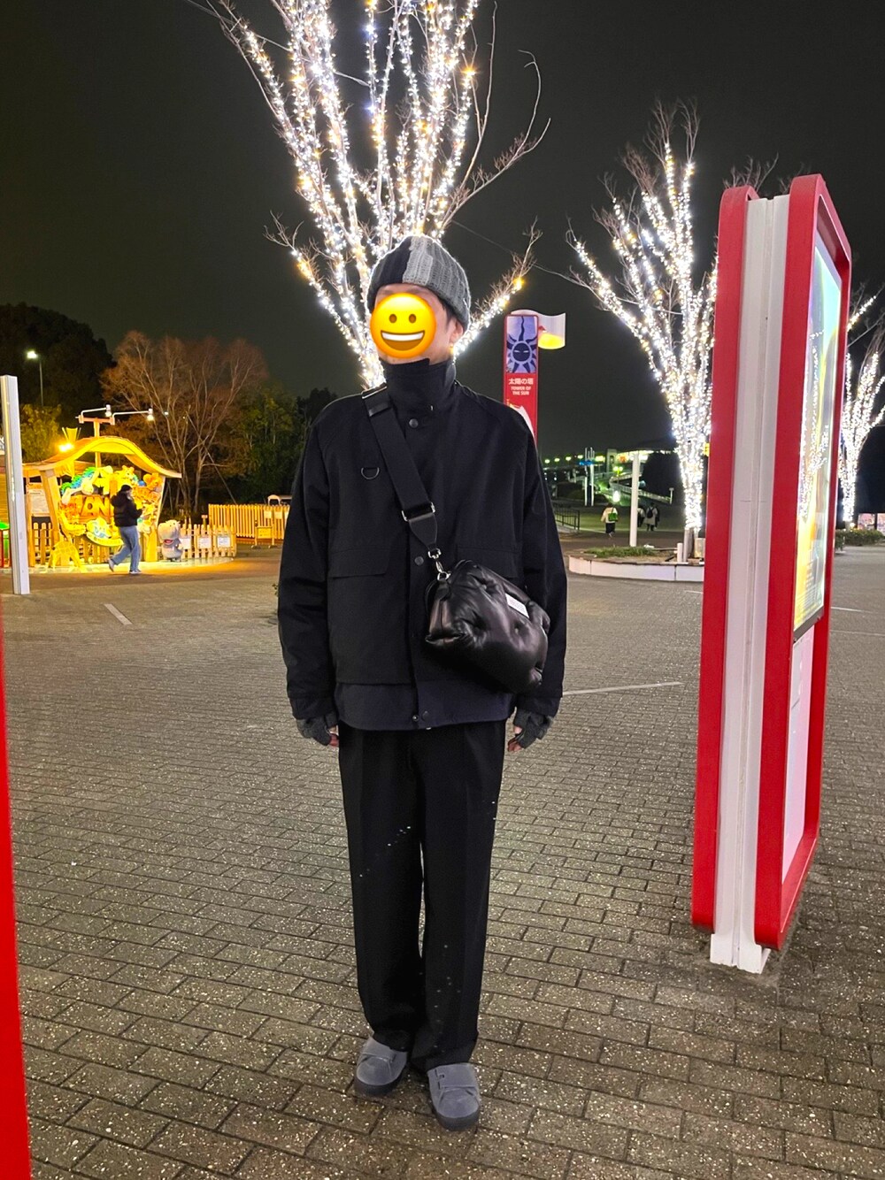 冬のブラックコーデです。 キャップ、シューズ、グローブをグレー で合わせてアクセント付けてみました。