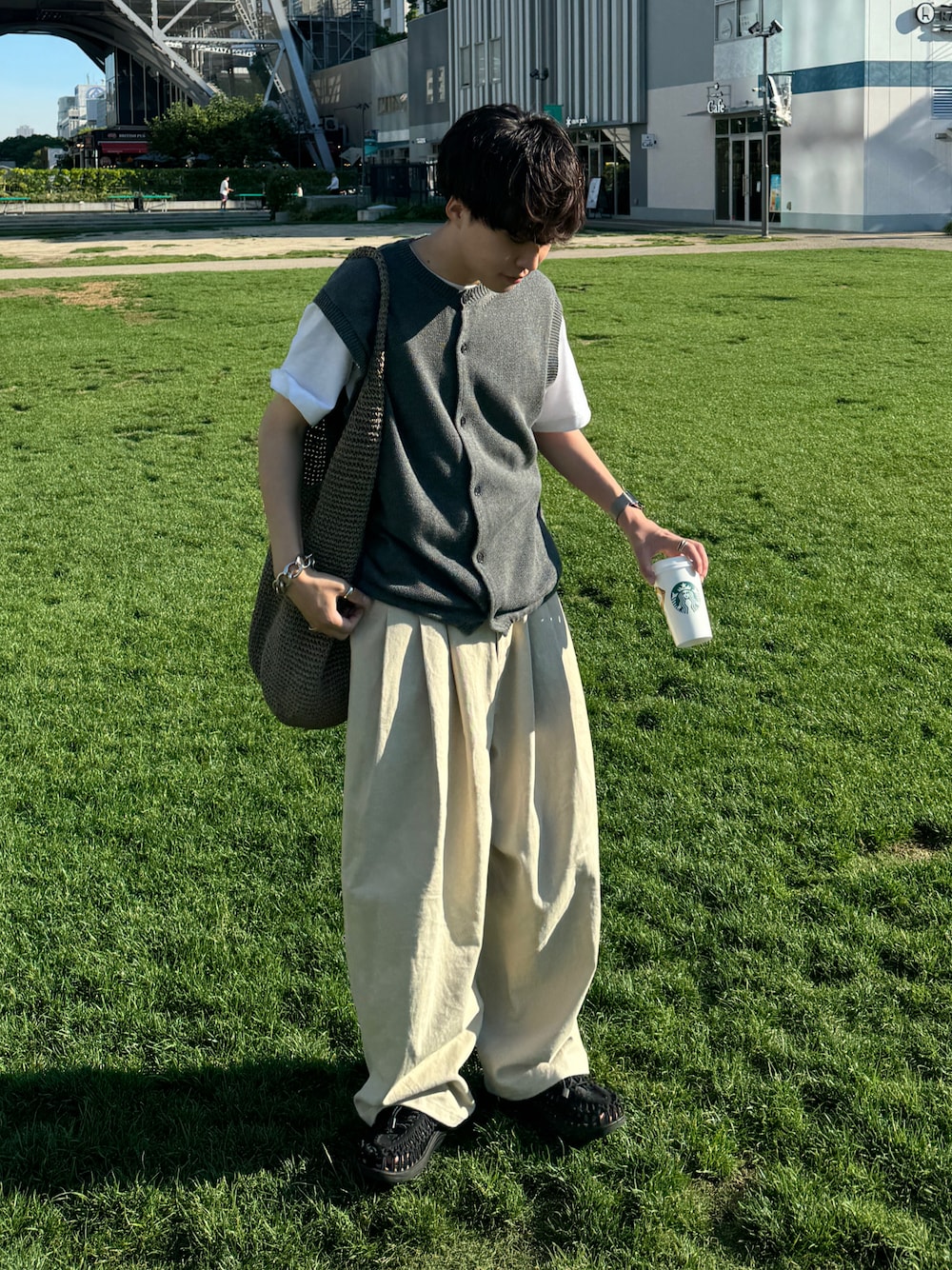 りょうのベスト「JOHN MASON SMITH 7G CREW NECK FRONT BUTTON VEST (24SKN-#241S)」を使ったコーディネート