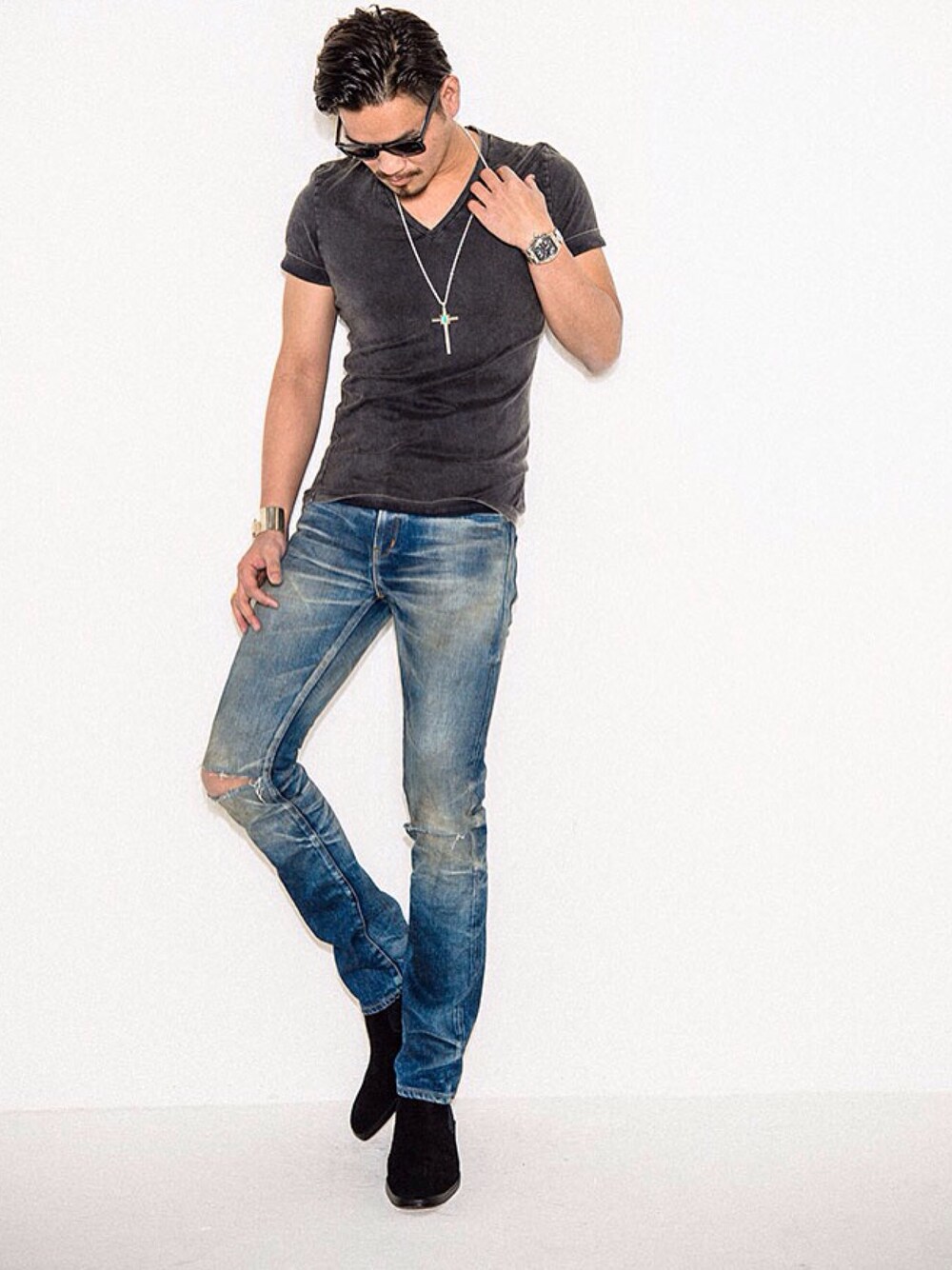 resoundclothing style 特殊ケミカル加工ロールアップTシャツ フル加工の ヴィンテージクラッシュ スキニーデニム リアルな色落ちがたまらない 靴は新たに 1から木型を作成した 深みのあるサイドゴアブーツ ネックレスはresound native cross すべてmadeinjapan すべてresound clothing
