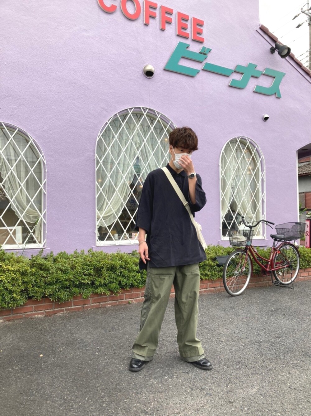 行きたかったカフェの前にて! パンツはstandard journalのカーゴパンツです!気に入ってます😁