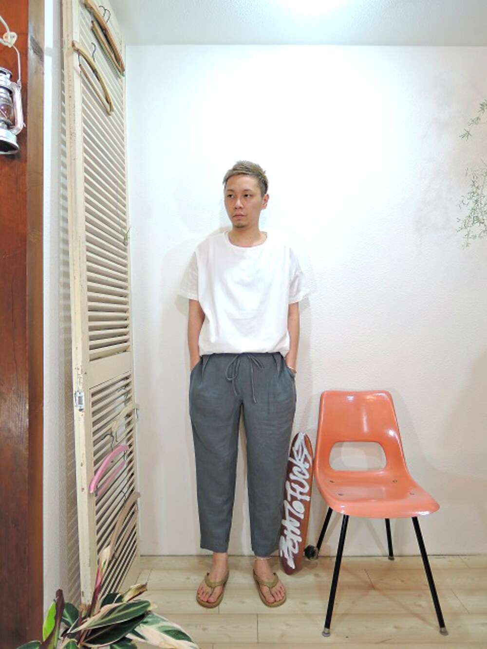 shirt/MANUAL ALPHABET-5oz CHAMBRAY PULL SHT TEE(SIZE 1) inner/ELEVEN EIGHT-T/Cレギュラーワッフル タンクトップ(SIZE M) pants/Badhiya-1 TUCK PANTS -LINEN-(SIZE 1) shoes/LANTIKI CROWN-SEA SUN(SIZE L)