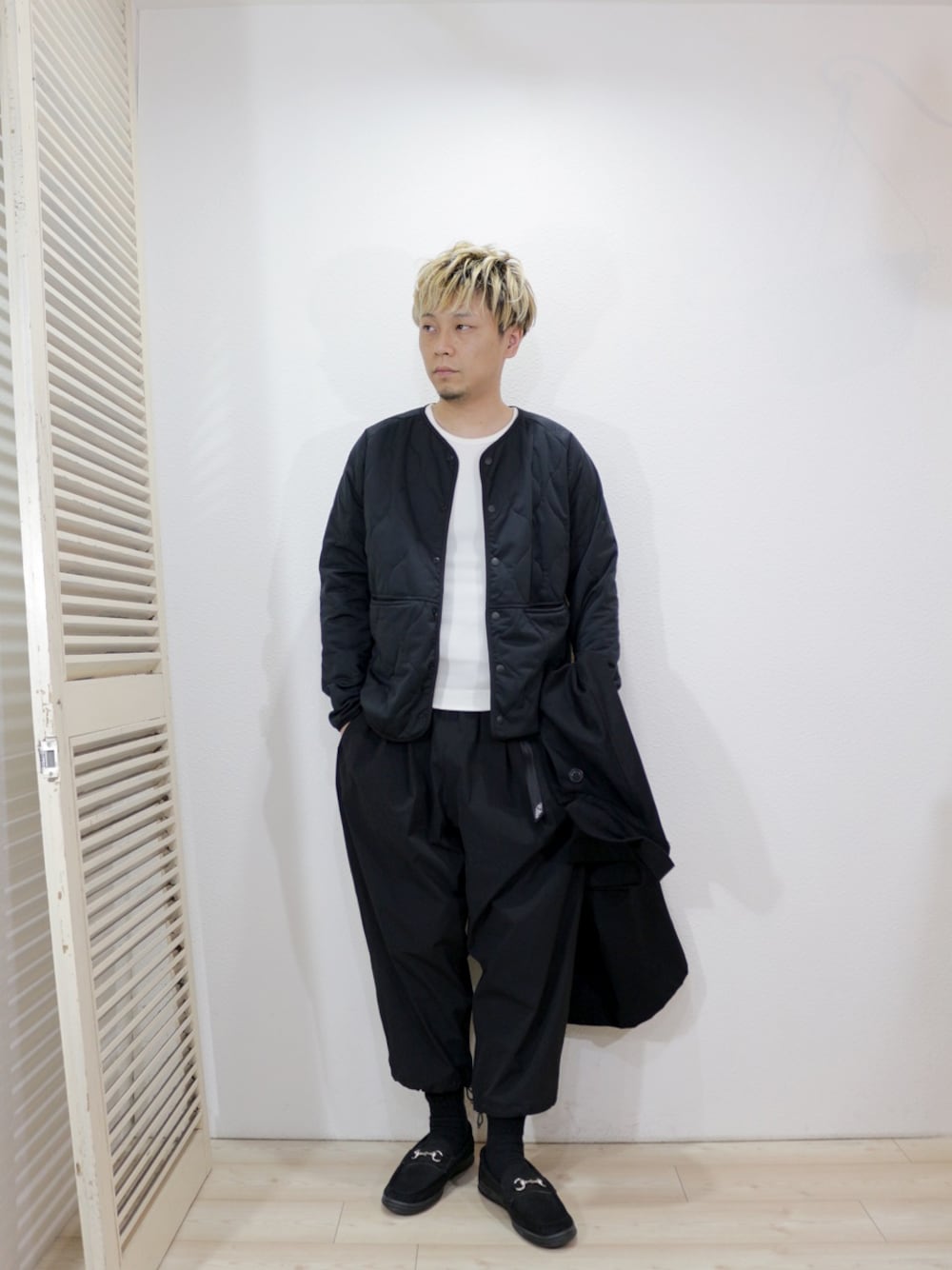 coat/Yarmo-DUSTER COAT(SIZE 40) tops/SUNNY SPORTS-LEVEL5 SOFT SHELL CARDIGAN(SIZE S) tee/LOCALINA-MERIYASU-L/S CREW NECK(SIZE 2) pants/MANEBU- ”LOOSE EASY TUCK SLACKS”PANTS(SIZE M) shoes/MANEBU-”BITCH”NUBUCK(SIZE 40)