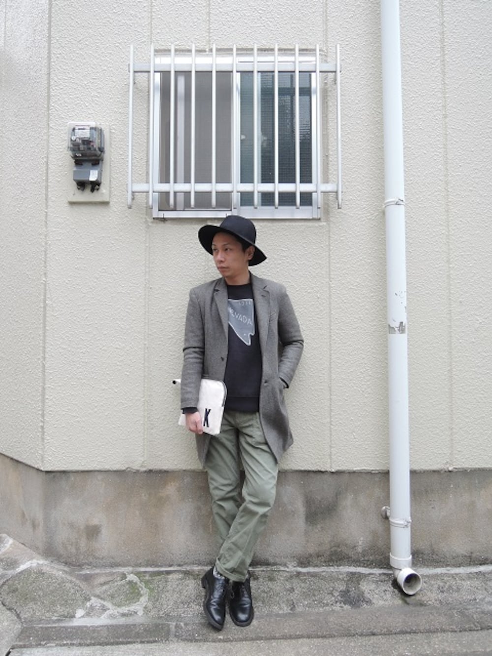 outer/Snugpak-Chester Coat MOON(SIZE S) tops/SALT WATER COWBOY-"NEVADA"CREW SWEAT(SIZE S) pants/FOB FACTORY-KITCHEN PANTS(SIZE S) hat/9.-LONG BRIM WOOL HAT(SIZE FREE) bag/Butler Verner Sails-10号パラフィンキャンバス ジップクラッチバッグ(SIZE FREE)