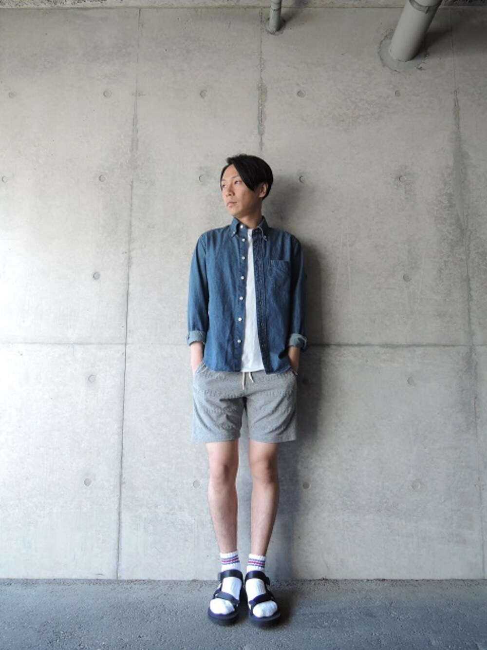 shirt/MANUAL ALPHABET-6oz DENIM BD SHT(SIZE 1) tee/FRUIT OF THE LOOM- CREW NECK SHORT SLEEVE TEE 2PACK(SIZE M) pants/SUNNY SPORTS-SPORTS SHORTS(SIZE S) shoes/SUICOKE-DEPA(SIZE US8)