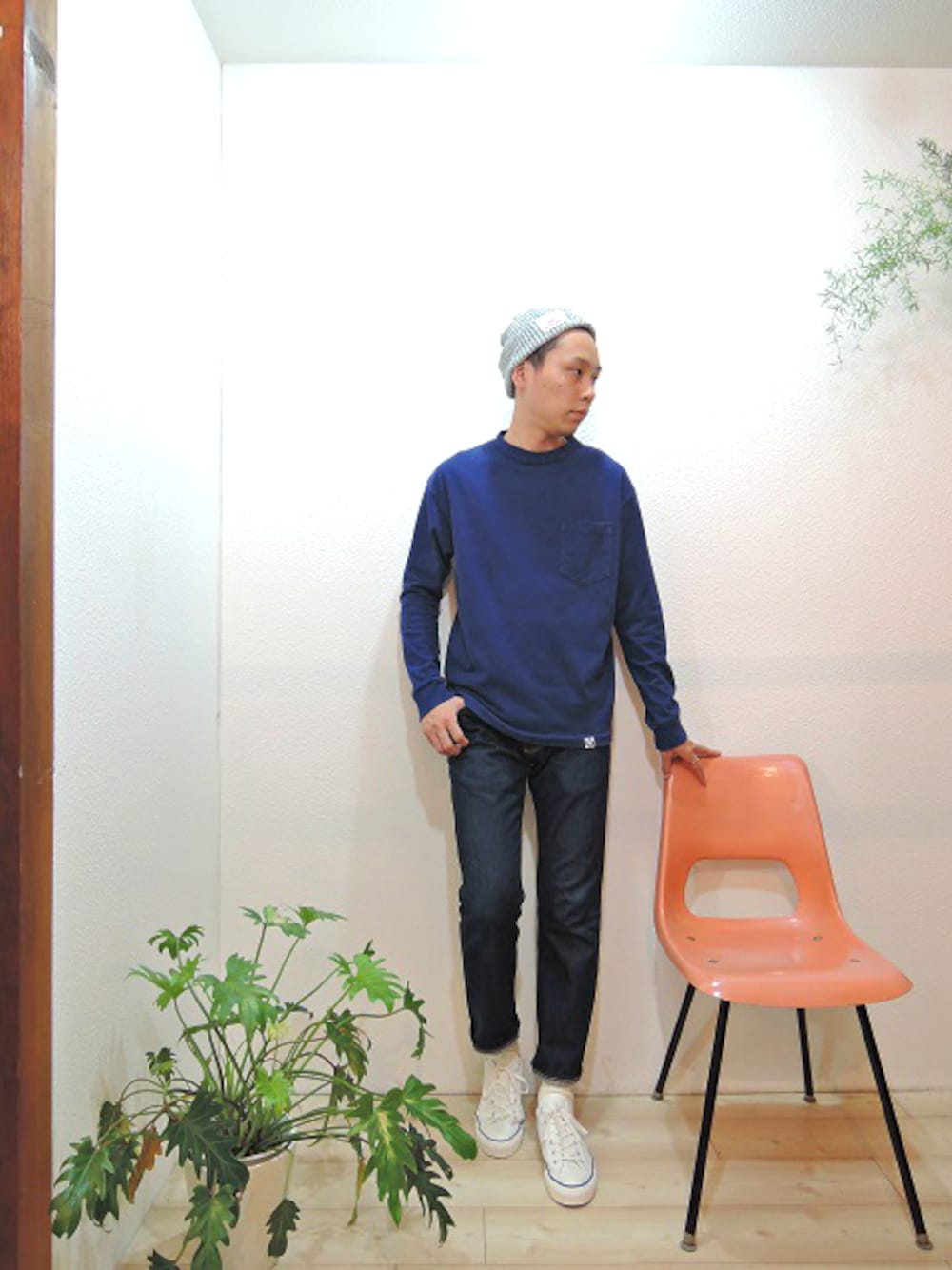 tee/TOWN CRAFT-CLASSIC LS POCKET TEE(SIZE M) pants/SUNNY SPORTS-VENICE JEANS(SIZE 30) shoes/SUNNY SPORTS-MOON&SUN CANVAS SNEAKER(SIZE US7) cap/SUNNY SPORTS-SILK WATCH CAP(SIZE ONE) accessory/STUDEBAKER METALS-TWISTED CUFF(SIZE M)