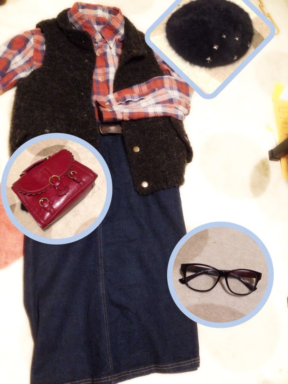 ネルシャツは古着 帽子はファーのスタッズ付き(一昨年の福袋です。笑 写真にはありませんが グレーの靴下に茶色いローファーを合わせました
